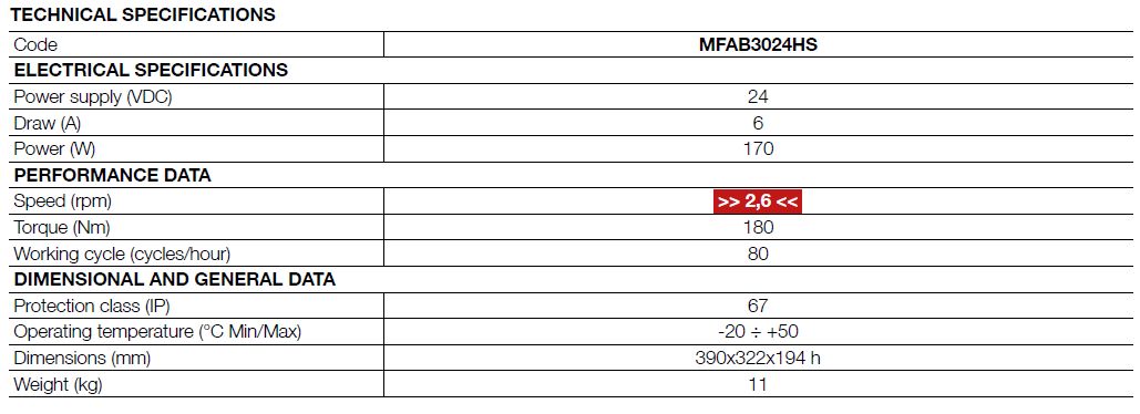 يعمل المحرك بجهد 24V DC ومزوّد بـ مشفر مغناطيسي (Magnetic Encoder) لضمان دقة الحركة والتحكم الكامل، مع قدرة على تنفيذ مناورات سريعة حتى في حالات الاستخدام المكثف. يمكن للبوابة أن تفتح بزاوية 90 درجة خلال حوالي 8 ثوانٍ (حسب ظروف التركيب القياسية).