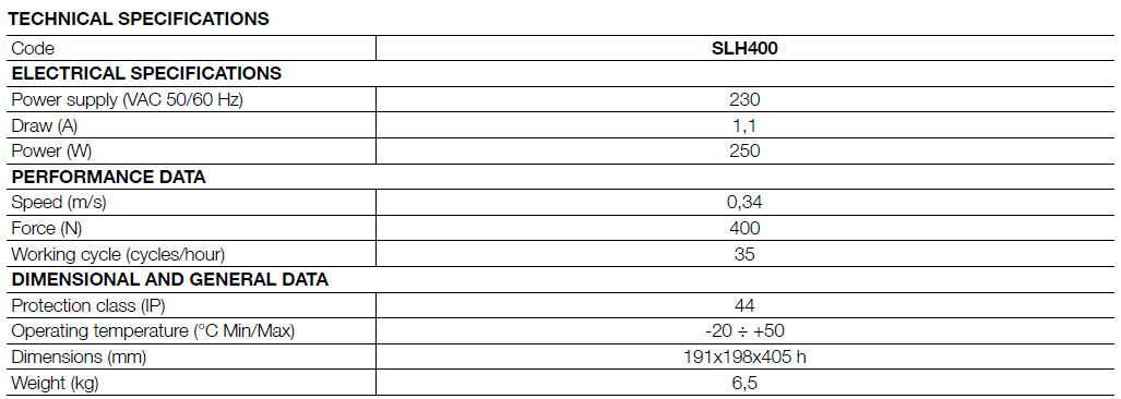 محرك SLH400 مخصص للأبواب المنزلقة بوزن يصل حتى 400 كغ وطول يصل إلى 6 أمتار لكل لوح. يتميز بتصميم عمودي مدمج يجعل التركيب سهلاً حتى في المساحات الضيقة، ويحتوي على وحدة تحكم مدمجة ومحدد حركة مطلق (Absolute Encoder) يتيح برمجة دقيقة وسريعة للحركة.